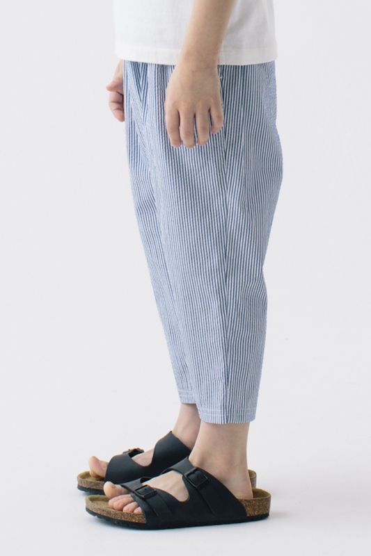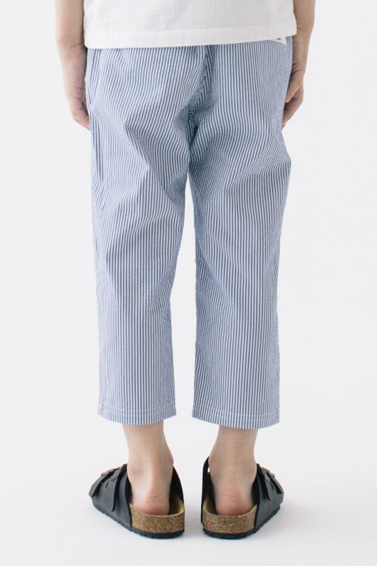 爽やかなシアサッカーストライプのアンクルパンツ。春夏の涼しげなスタイルにはピッタリな一本です。同じ素材のテーラードジャケットを展開していますので、セットアップでの着用もできます。