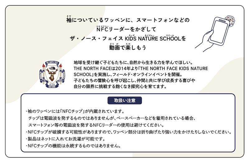 地球を受け継ぐ子どもたちに、自然から生きる力を学んでほしいという想いでTHE NORTH FACEでは 2014年からキッズアウトドアイベント「 THE NORTH FACE KIDS NATURE SCHOOL(以下、KNS)」を実施しています。子どもたちの冒険心を呼び起こし、仲間とともに成長する喜びや飽くなき探究心を育むコンテンツを楽しむことができる、NFCタグ内蔵のワッペン付きTシャツです。袖のワッペンにNFCタグが内蔵され、スマートフォンなどのNFCリーダーをかざすと、KNSの動画ページにアクセスができます。