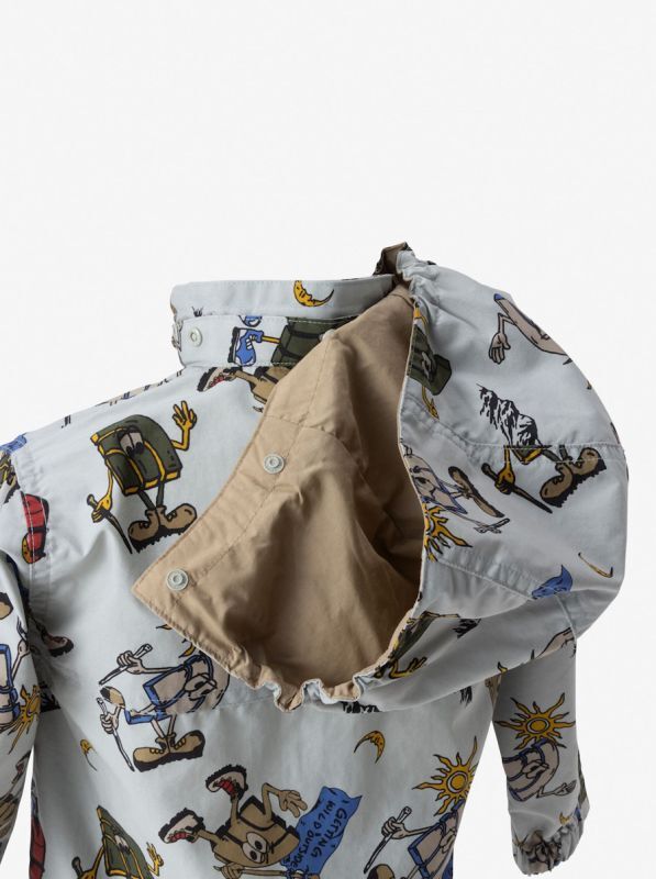 フードはスナップボタンで取り外しが可能で、外したときにはボタンを襟の中にしまうことができます。