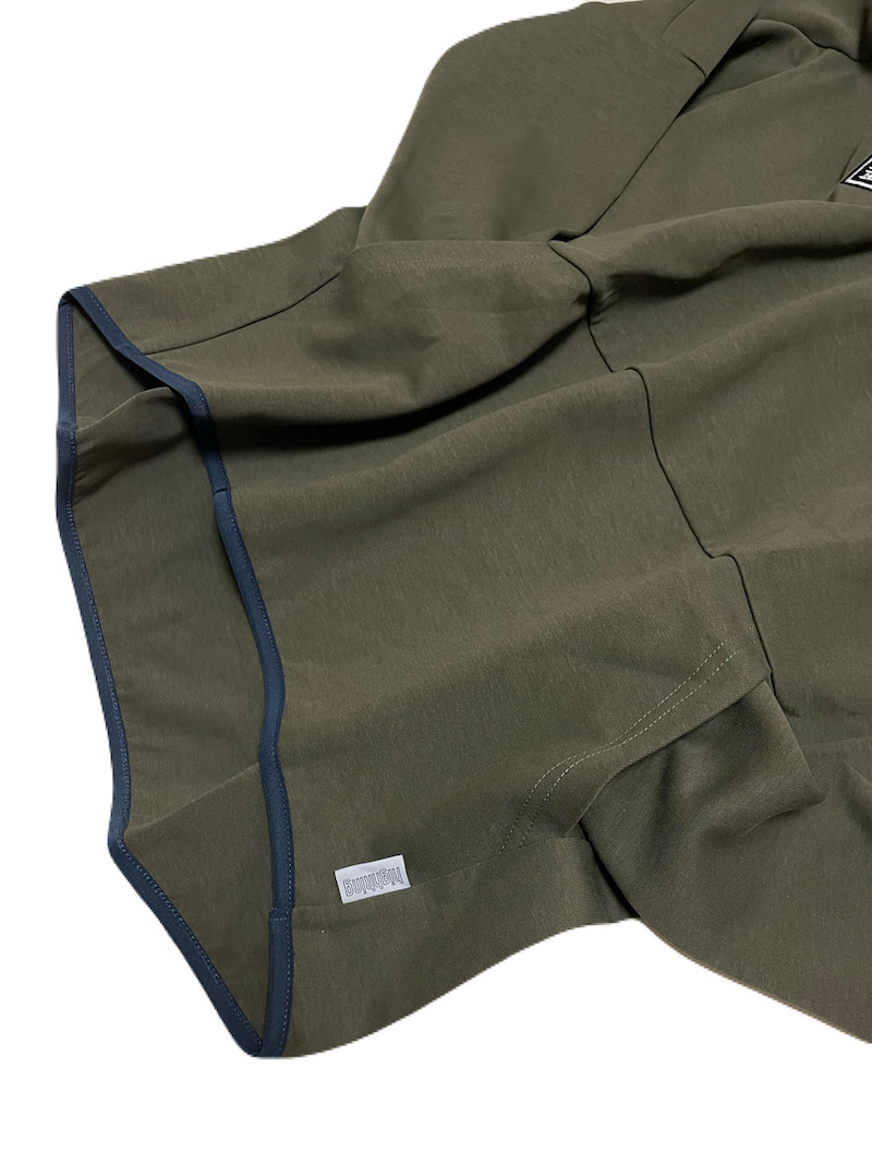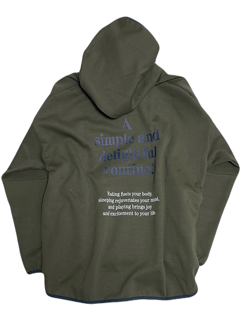 保温性と通気性を兼ね備える特殊3層構造生地"ダンボールニット"素材を使用した大胆な切り替えとパイピングの配色が斬新なフーディー。