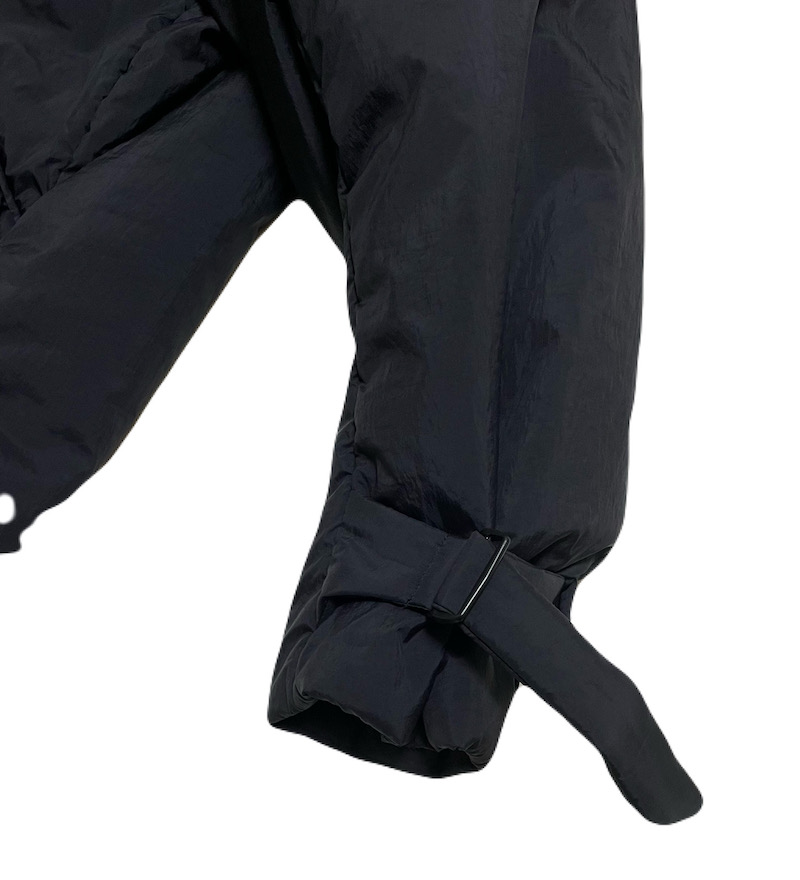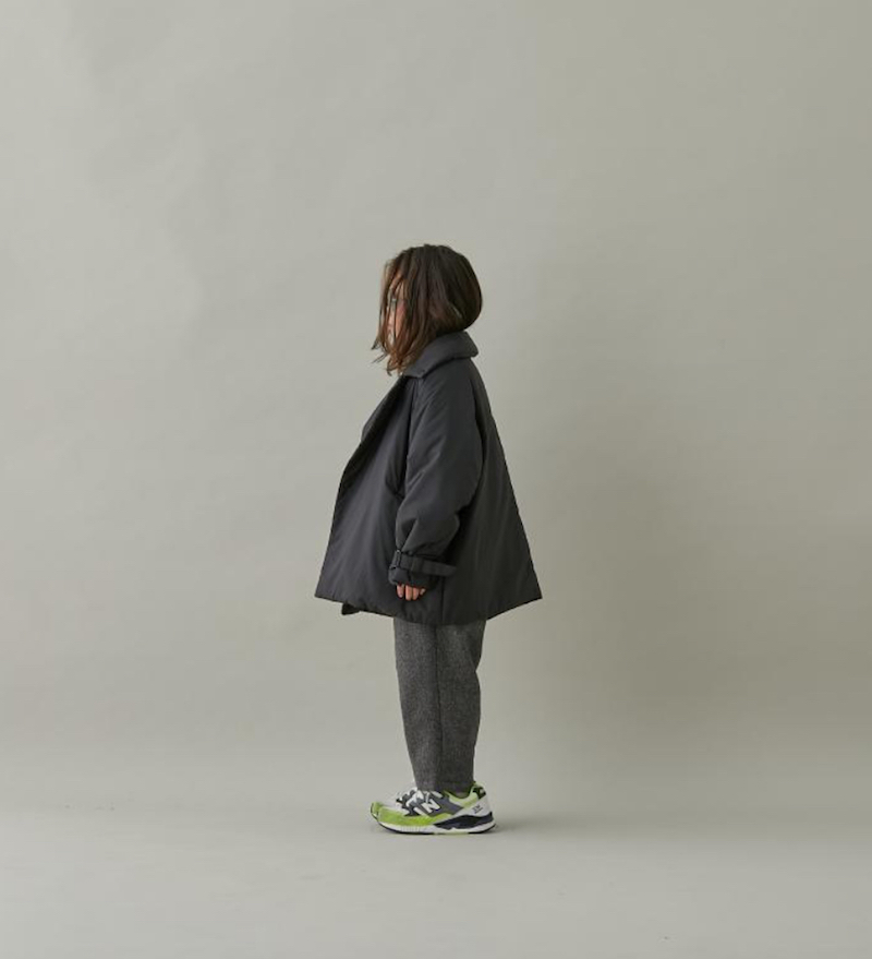 オーセンティックなダブル仕立てのハーフコートを、ゆったりとしたシルエットと、軽量なナイロン素材の中綿入りにすることで、とても軽く暖かく、フワッとしたボリューム感とリラックス感のあるスタイリッシュな雰囲気になっています