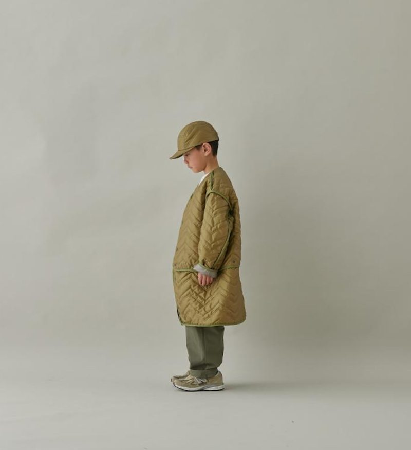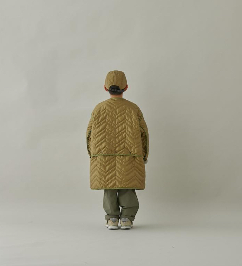 ミリタリーコートのキルティングライナーをモチーフにした、ゆったりとしたワイドシルエットのコート