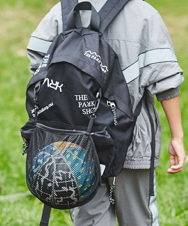 ロゴ刺繍の幅広デイバッグ。底のポケットにはボールなどを収納できるメッシュカバー付き。