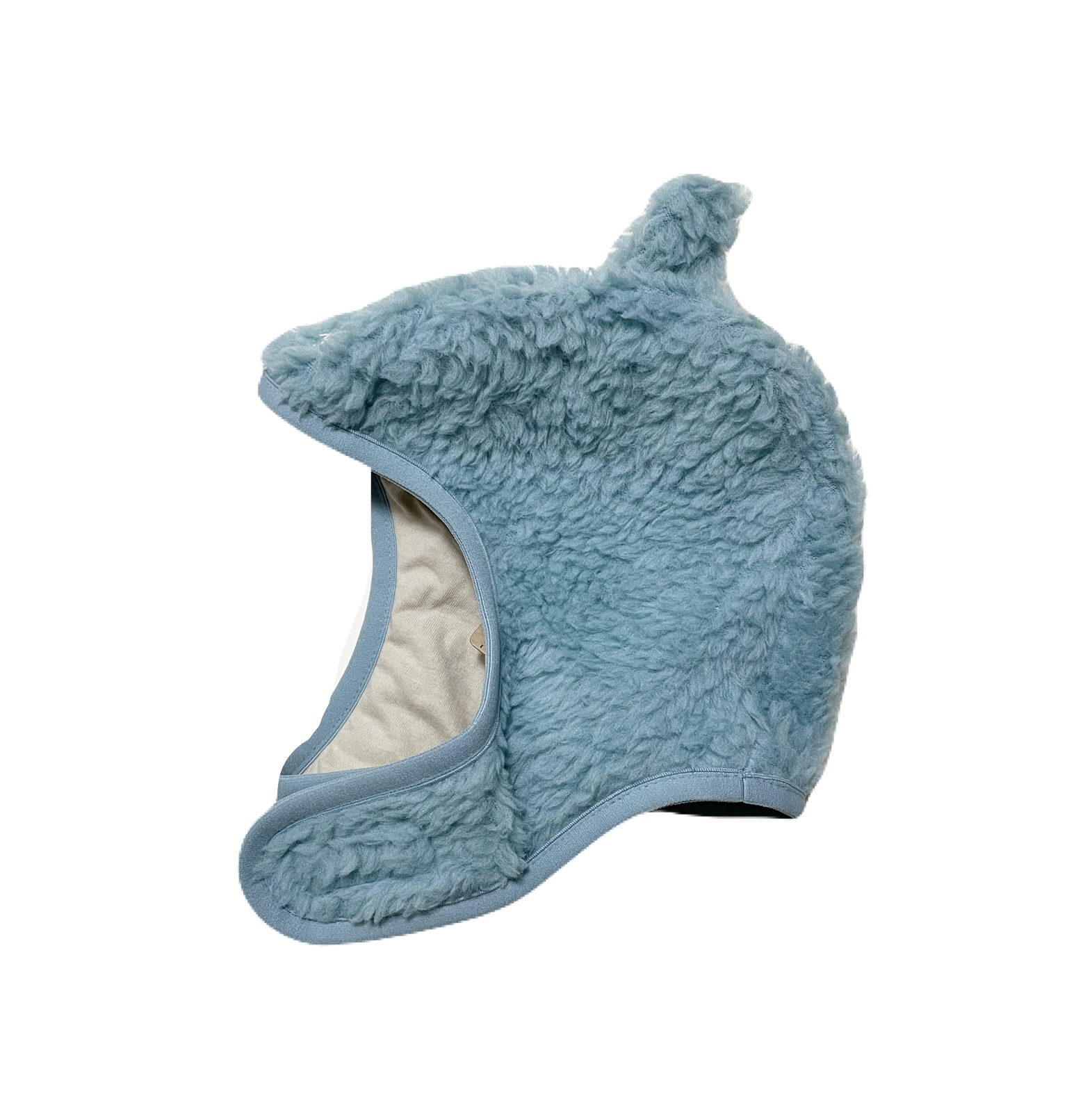 表面にはかさ高のある毛足の長いボアフリース、裏地には肌触りのよいコットン天竺の生地を使用したベビーキャップ。
