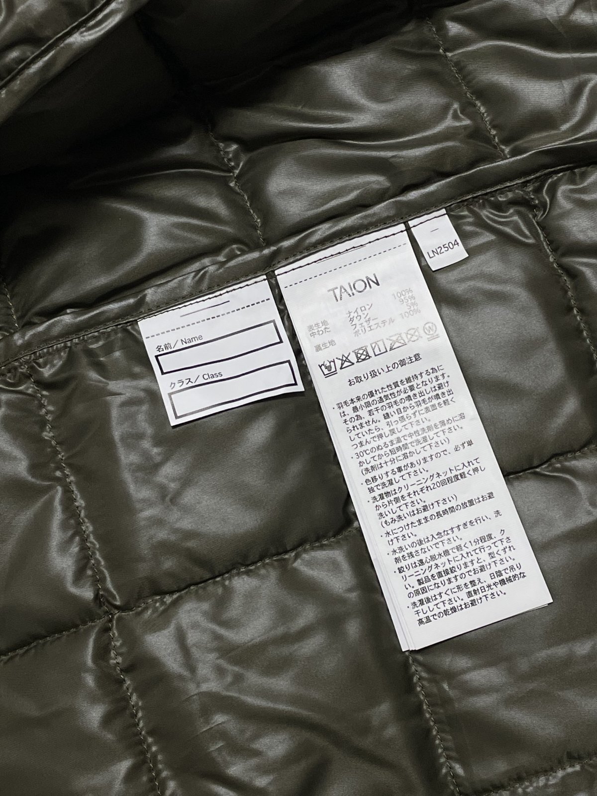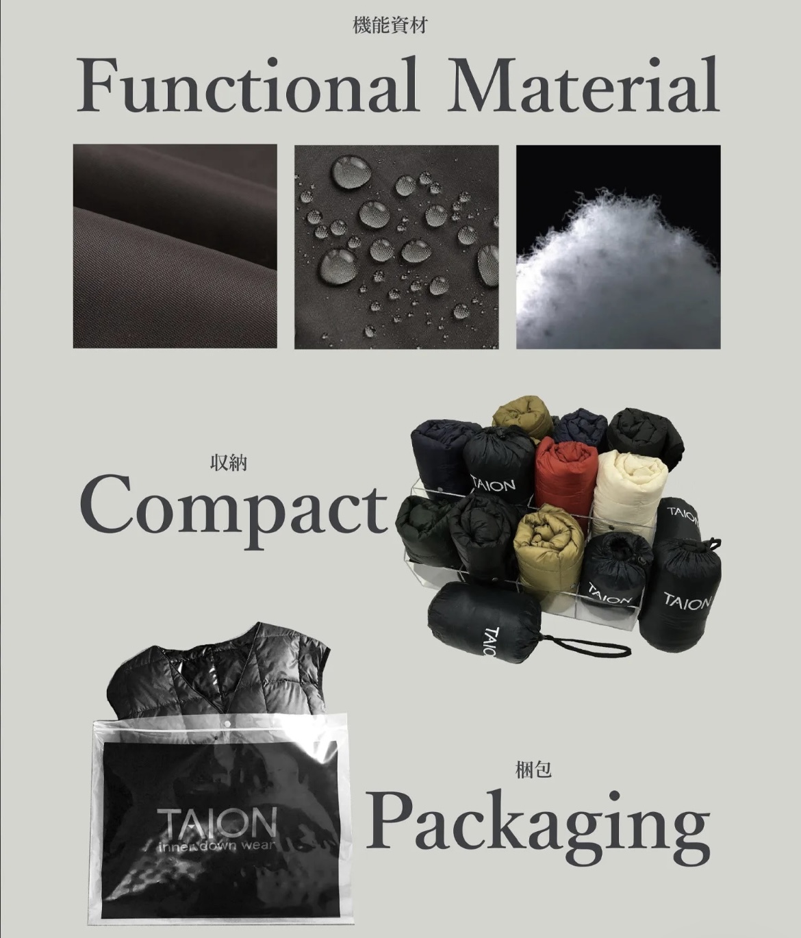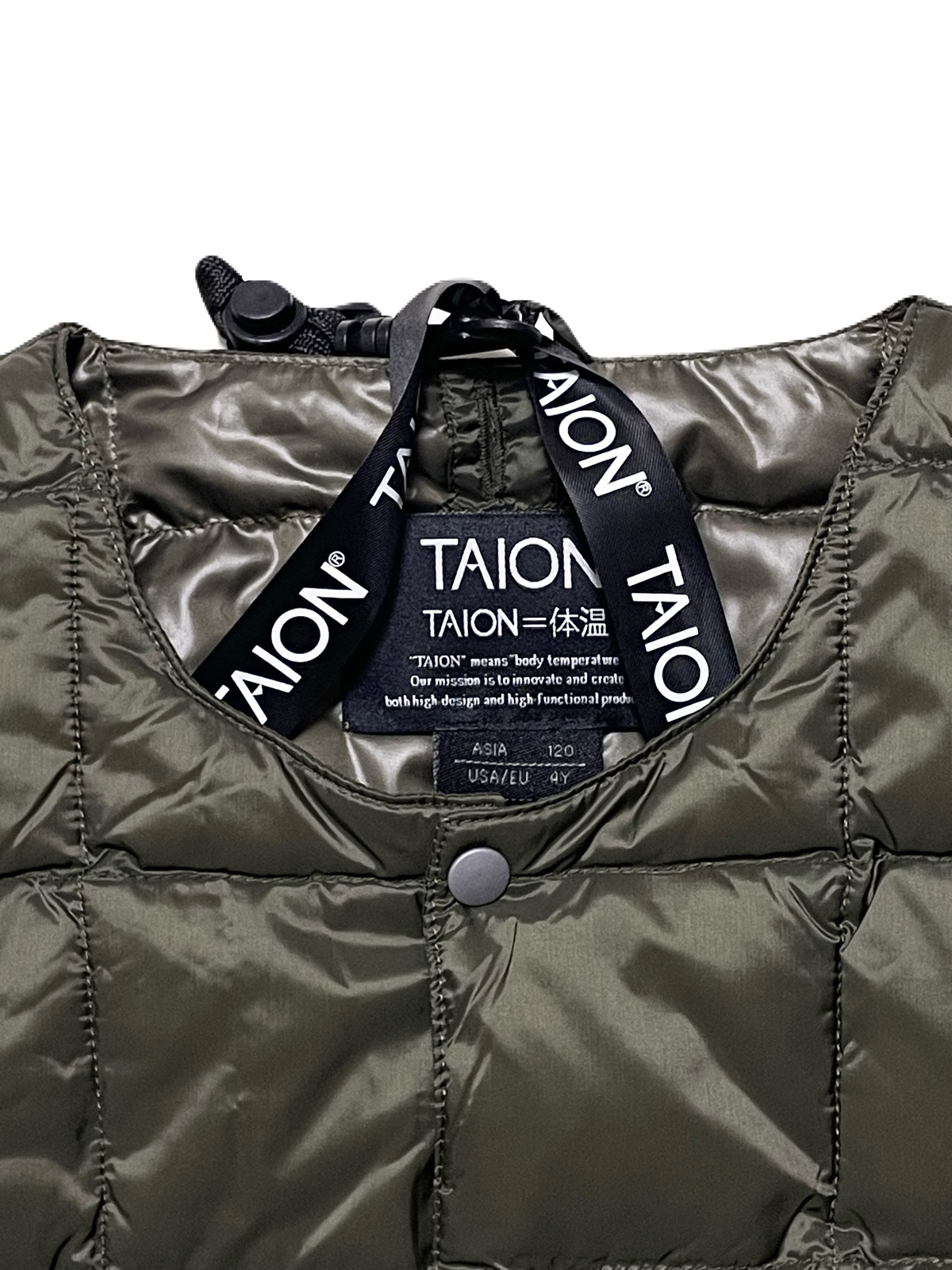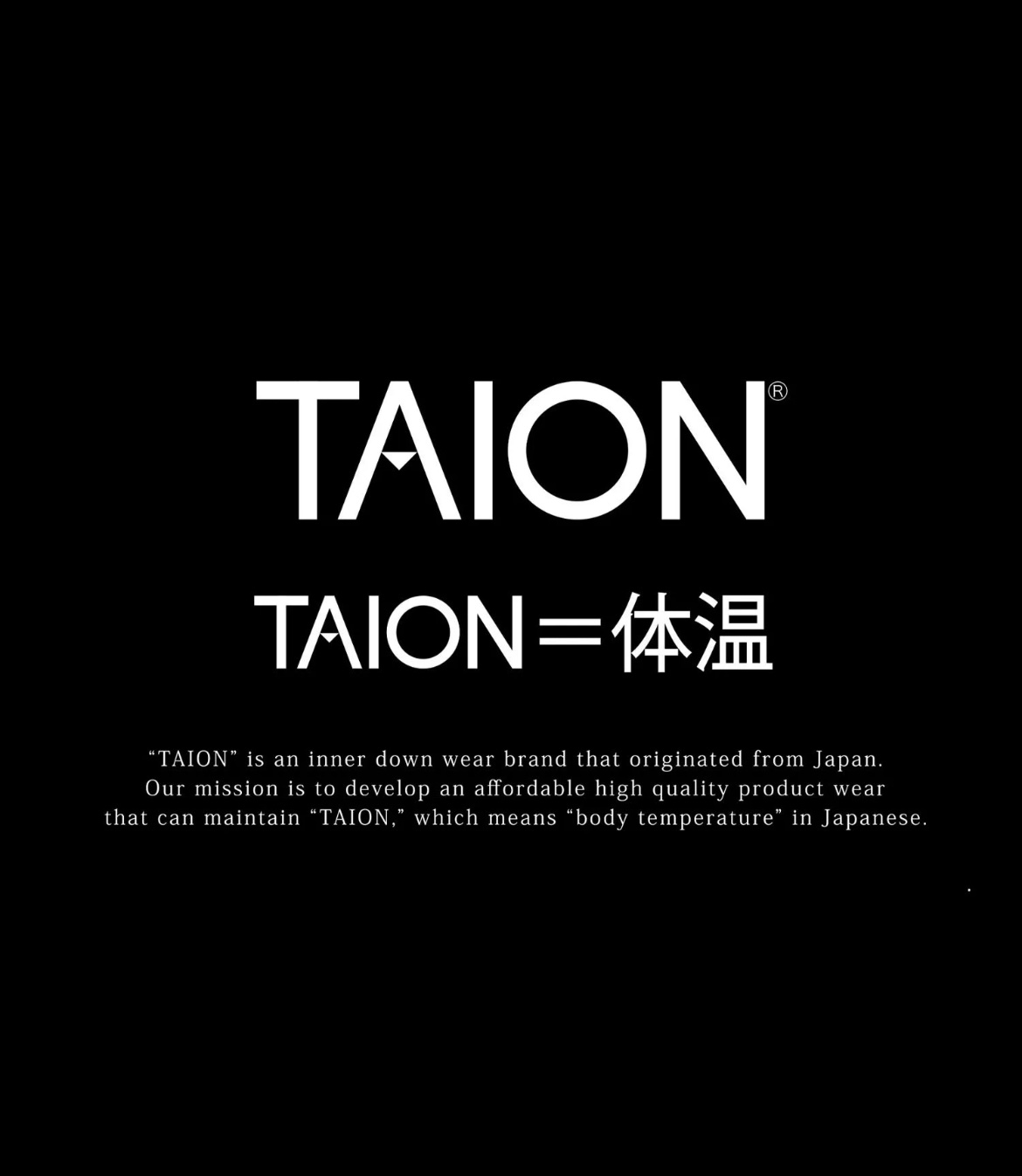 TAIONは、2016 年日本発のインナーダウンに専業したブランドとして展開。 ブランド名の由来は、TAION=体温(潜在的な暖かさ、日本発のイメージ) クオリティーに対して圧倒的な コストパフォーマンスによる、価値の追求を スローガンとし、 高品質で高機能なインナーダウンを幅広く展開している。