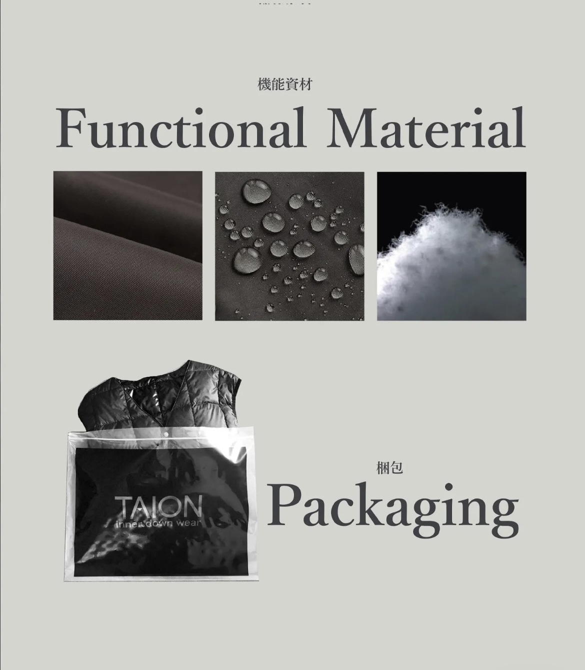 TAIONは、2016 年日本発のインナーダウンに専業したブランドとして展開。 ブランド名の由来は、TAION=体温(潜在的な暖かさ、日本発のイメージ) クオリティーに対して圧倒的な コストパフォーマンスによる、価値の追求を スローガンとし、 高品質で高機能なインナーダウンを幅広く展開している。